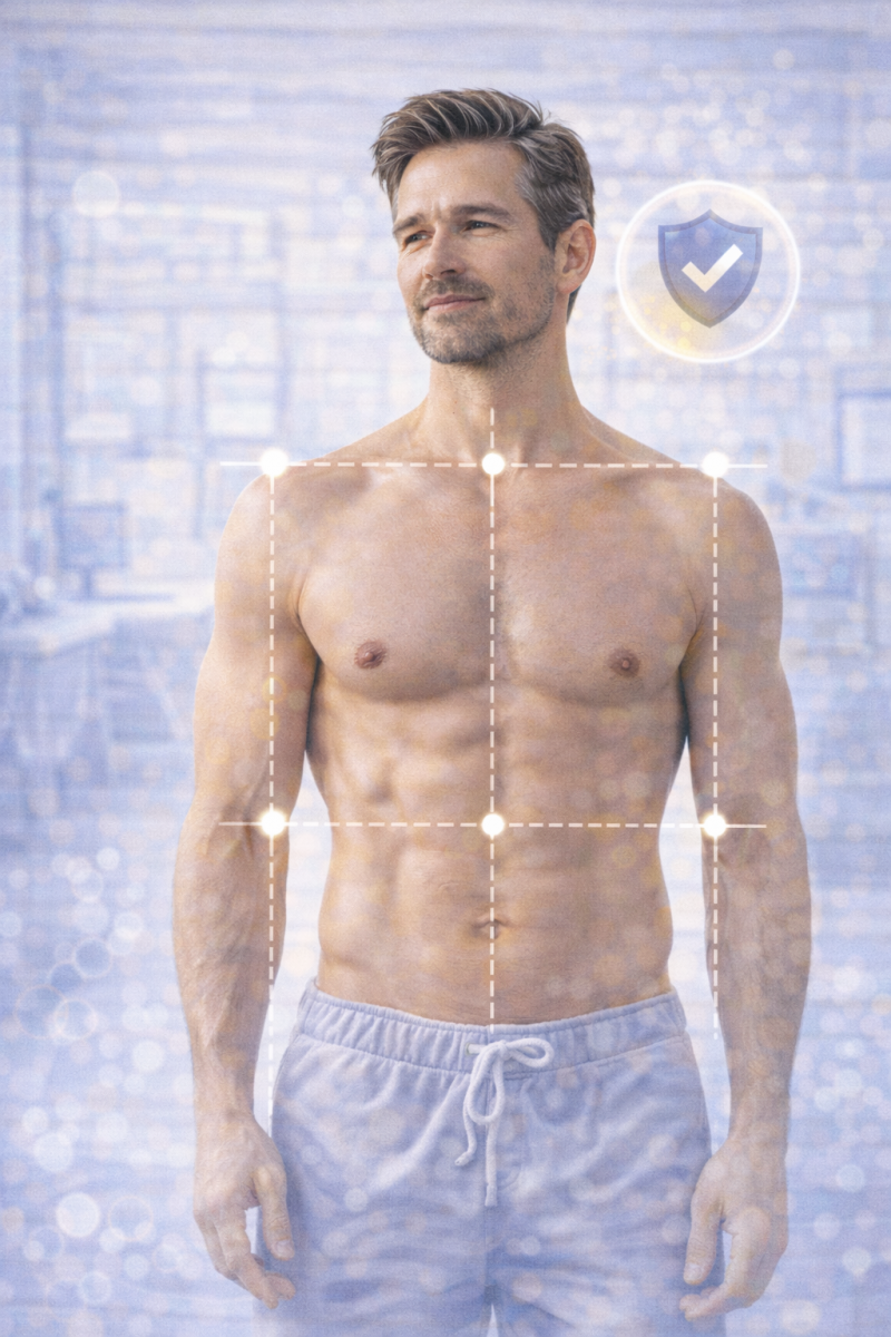 Avaliação estética da região íntima masculina, com foco em harmonia, proporção e simetria, respeitando a individualidade do homem.